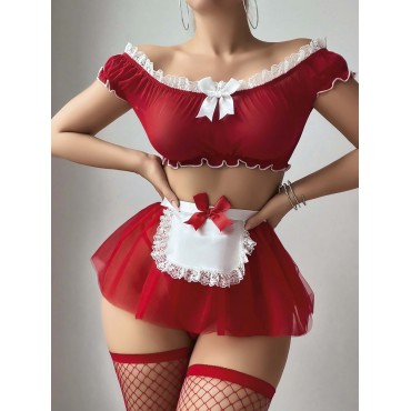 Kadın Kırmızı Fiyonklu Etekli Seksi Hizmetçi Kostümü