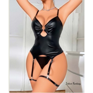 Siyah Lateks Parlak Kumaşlı Bacak Aksesuarlı Derin Dekolte Jartiyer..