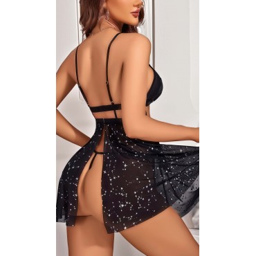 Siyah Parlak Dekolteli Dantelli Seksi Erotik Gecelik..