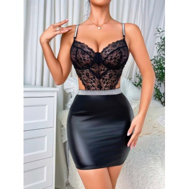 Siyah Parlak Dekolteli Dantelli Seksi Erotik Gecelik