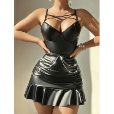 Siyah Suni Deri Zincir Detaylı Mini Elbise Kostüm..
